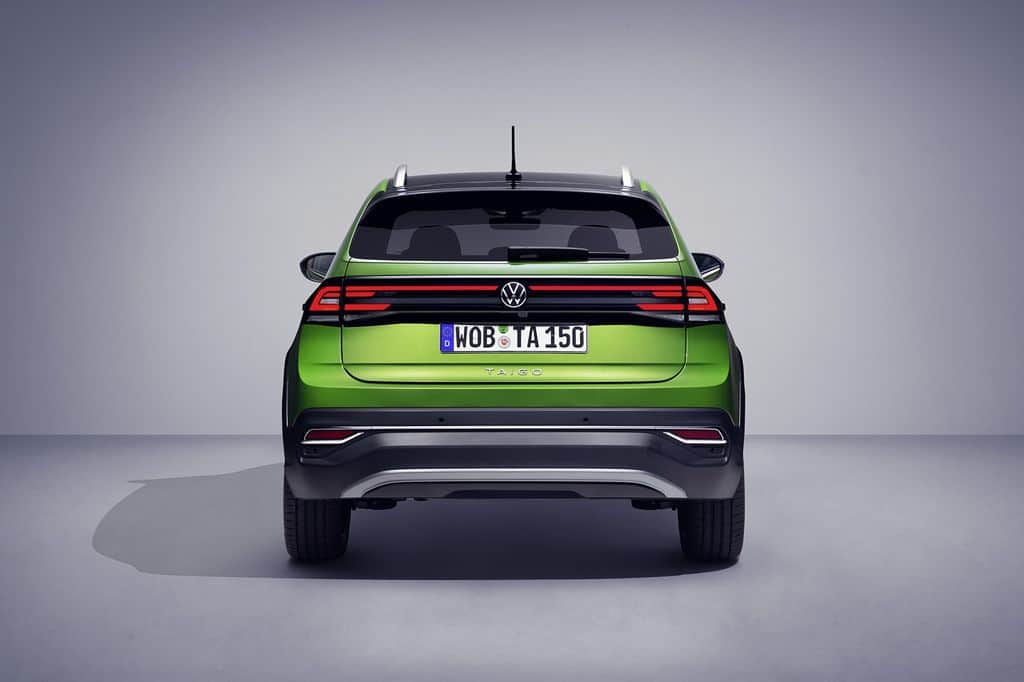 Di chuyển ra phía sau, Volkswagen Taigo 2022 có phần đèn hậu được nối liền với nhau bằng một dải đèn mảnh nằm chạy ngang hết phần cửa cốp, cánh gió mui đen tích hợp đèn phanh trên cao. Thêm vào đó phía dưới biển số xe là tem chữ nổi Taigo.